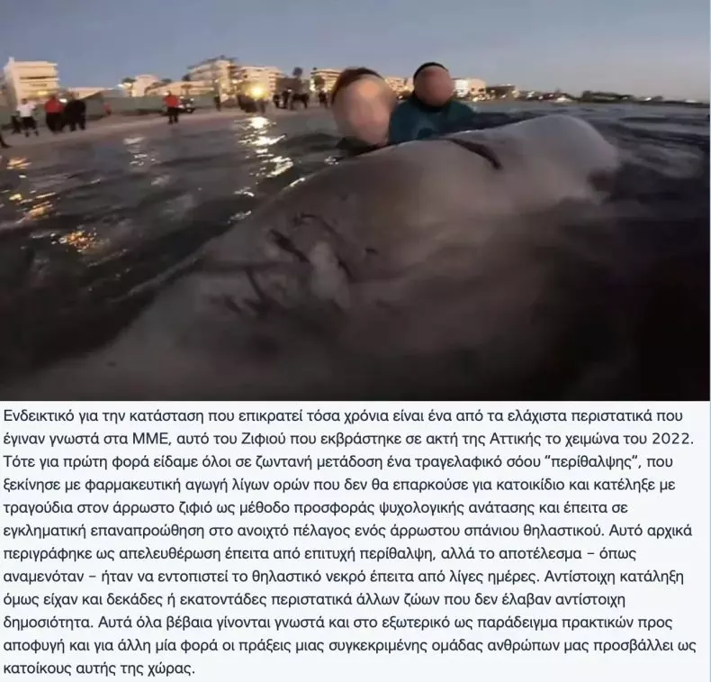 Έτσι πέραν από τα όποια αυτονόητα νομικά μέτρα, μονόδρομος είναι πλέον και η πλήρης δημοσιοποίηση και διαφάνεια αναφορικά με τους εμπλεκόμενους και τις απερίγραπτες διαδικασίες, με μοναδικό γνώμονα την ευζωία των θαλάσσιων ειδών που έχουν ανάγκη περίθαλψης. Αυτή η οδύσσεια δεν είναι προσωπικό ζήτημα, αλλά θα πρέπει να αφορά όλους όσους έχουν θεσμική υποχρέωση πάνω στην περίθαλψη και την ευζωία των ζώων, καθώς και τους φορείς και τους πολίτες που ενδιαφέρονται ειλικρινά για να ανοίξει μία νέα σελίδα στην Ελλάδα σε ότι σχετίζεται με την περίθαλψη των θαλάσσιων ειδών.